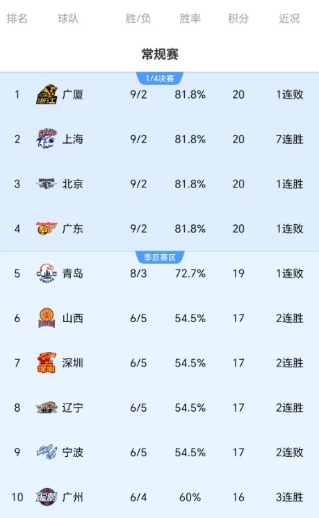 - CBA常规赛第11轮战罢,积分榜呈现前所未有的激烈格局。广厦、上海、北京、广东四支豪强均以9胜3负的战绩并列...发表于: 01-07 20:38