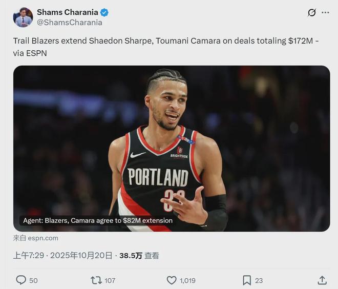 北京时间10月20日上午,据NBA名记Shams报道,开拓者连签两份大合同:4年9000万美元续约谢顿-夏普;4年8200万美元提前续约图马尼-卡马拉。这哥俩的合同加起来4年1.72亿美元,对开拓者