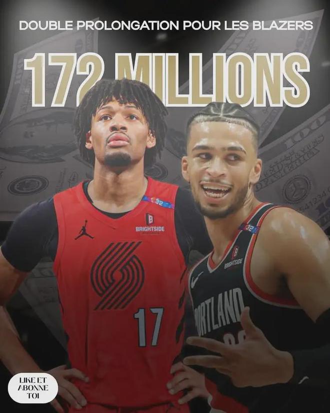 北京时间10月20日上午,据NBA名记Shams报道,开拓者连签两份大合同:4年9000万美元续约谢顿-夏普;4年8200万美元提前续约图马尼-卡马拉。这哥俩的合同加起来4年1.72亿美元,对开拓者来说绝对算是大手笔了。
