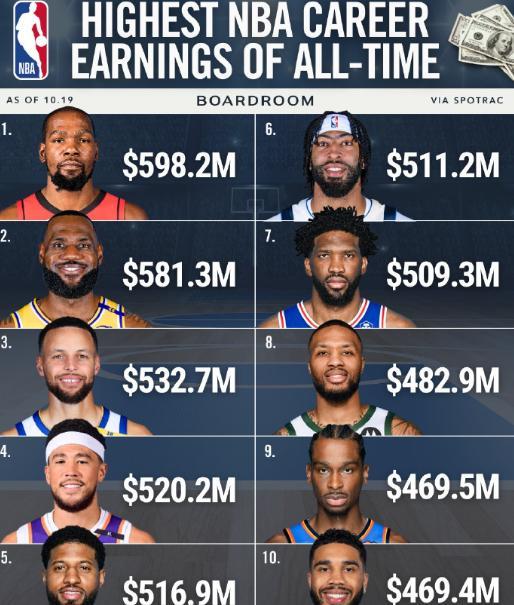 10月20日,根据美国薪资网站Spotrac数据,刚刚和火箭完成提前续约的杜兰特,职业生涯总薪水达到5.982亿美元,超越詹姆斯成为历史第一人!