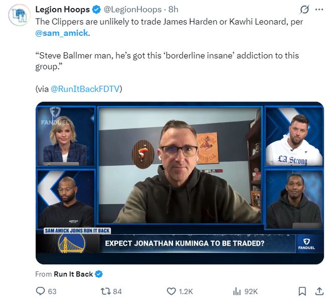 此前有消息称热火有意快船超巨科怀-伦纳德,但北京时间12月10日,TA记者萨姆-阿米克透露,洛杉矶快船不太可能交易哈登、伦纳德,因为鲍尔默对快船有近乎疯狂的执念。