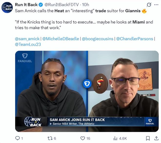 萨姆-阿米克在播客节目中谈到,热火是针对扬尼斯-阿德托昆博颇具吸引力的求购对象,如果尼克斯未能追逐扬尼斯成功,大家可以看看迈阿密的做法。