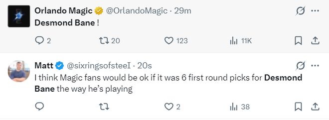 魔术记者马特调侃:我觉得魔术队球迷应该能接受用六个首轮选秀权去换德斯蒙德-贝恩,他现在打球这个状态超值啊。(今夏魔术是用4个首轮签+1个首轮互换权+波普+科尔安东尼换他,也就是7换1)