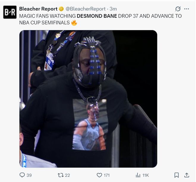 看台上有一位魔术的球迷Cos了贝恩此前拍摄定妆照时的样子,戴了一个黑色的面罩,贝恩一下子成为了奥兰多的英雄。