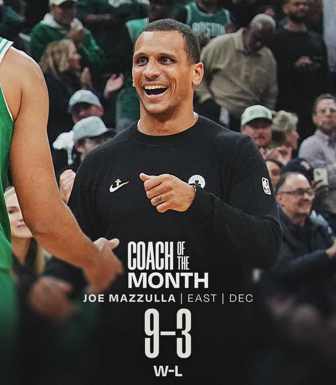 布伦森在12月份场均30.6分3.3篮板7.1助攻,投篮命中率47.5%,三分命中率40.5%。除了助攻,其余都比不上杰伦-布朗。看完数据对比,大家就能理解布朗为啥不满了。凯尔特人主帅马祖拉,成功当选12月份的东部月最佳教练。