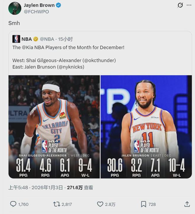 NBA官方公布12月份的月最佳球员,布伦森当选东部月最佳,亚历山大当选西部月最佳。凯尔特人球员杰伦-布朗转发这则报道,并表示不理解。此后布朗在直播中还说道:“无意冒犯亚历山大