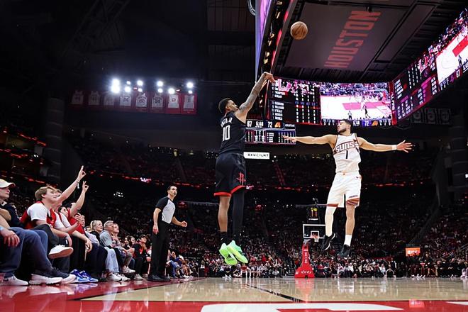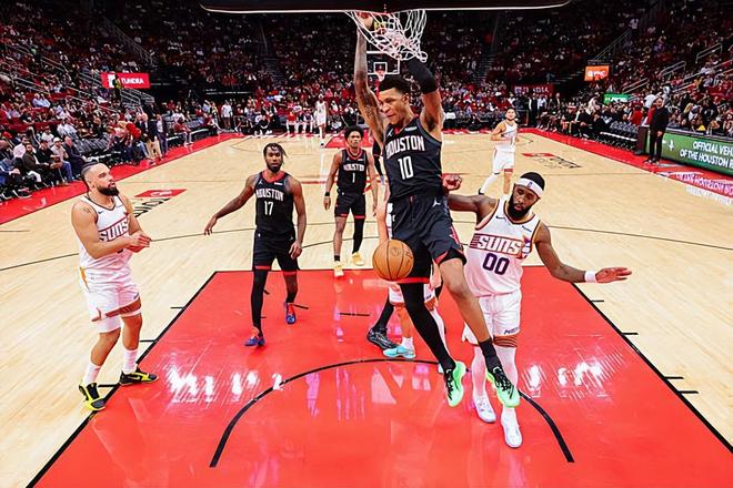本场比赛中,火箭的先发大前锋小贾巴里-史密斯(Jabari Smith Jr.)的表现还是相当不错的。史密斯全场出场38分23秒,投篮11中6,三分线外8中3,罚球4中2,得到了17分7篮板3助攻1抢断的数据,还有1次失误和2次犯规,正负值为+5。史密斯在上半场比赛中的表现实在是令人大跌眼镜,他的进攻效率一塌糊涂,他的得分能力和投射能力都没有办法发挥出来,而且他在防守端在专注度方面也存在着一定的问题。不过随着比赛的深入,史密斯的表现有了显著的提升,他在进攻端手感回暖,进攻效率回升,而且在防守端也是提升了自己的强度。史密斯在下半场比赛中以7中5的效率拿下了14分,在球队在进攻端陷入僵局的情况下,史密斯挺身而出,起到了决定性的作用。要不是有史密斯下半场比赛中的强势表现,杜兰特可能都得不到绝杀的机会。