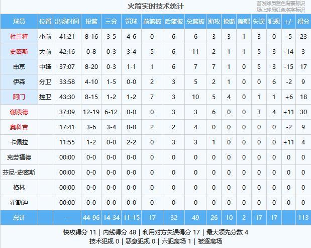 谢泼德30分3板6助、杜兰特23分6板3助3断、阿门18分10板5助4断、申京17分7板7助、伊森9分5板2助、奥科吉9分4板、卡佩拉4分3板1助、史密斯3分11板2助