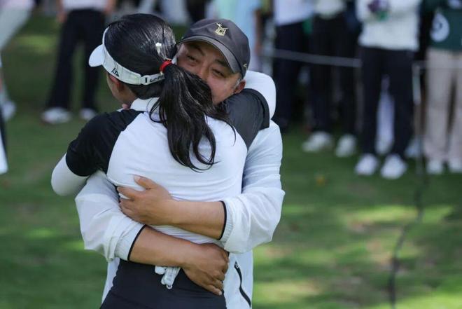 刘宇婕在广东女子公开赛夺冠后与父亲刘国梁拥抱庆祝。图片来自:女子中巡赛官网。