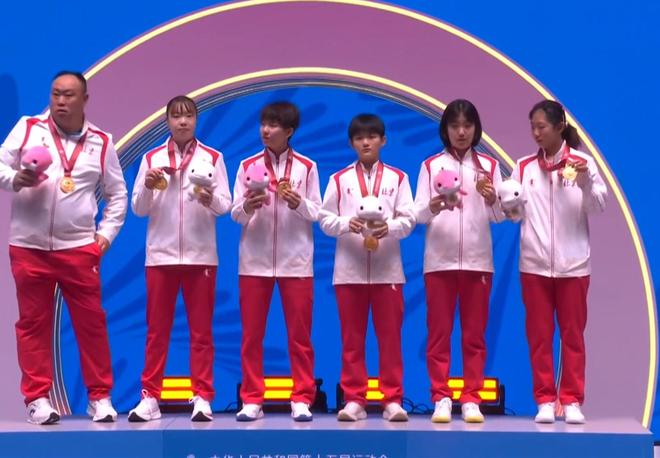 随着祝启慧在第四局以12比10击败姜依依,以3比1赢下第五场对决,北京U18女队以总比分3比2获胜,夺得了粤港澳全运会乒乓球项目的第一块金牌。祝启慧回到场边,这时候北京U18女队个个