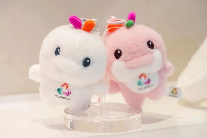被戏称“大湾鸡”和“大癫鸡”的它们, 其实名叫“喜洋洋”与“乐融融”, 原型来源于安静(纯白) 和运动时(充血变粉)的中华白海豚。