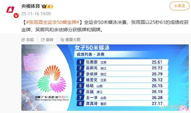 据央视体育微博消息,全运会50米蝶泳决赛,张雨霏以25秒61的成绩收获金牌,吴卿风和余依婷分获银牌和铜牌。编辑 李忆林子