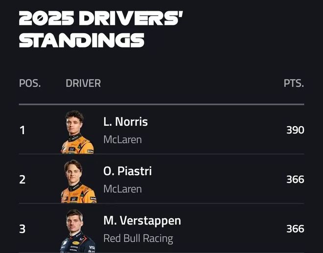 在诺里斯和皮亚斯特里的本站积分归零之后,诺里斯依旧在2025赛季车手积分榜上以390分位居第一,皮亚斯特里和本站收获冠军的维斯塔潘同积366分并列第二。