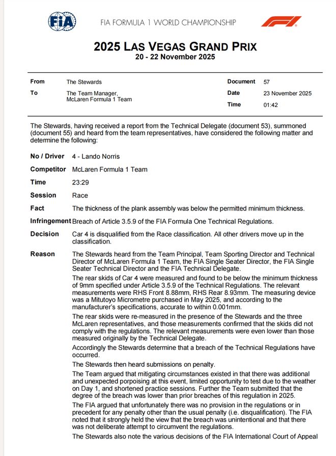 2025赛季F1拉斯维加斯大奖赛正赛刚刚结束,麦克拉伦便遭遇晴天霹雳!国际汽联赛后发布公告称,由于诺里斯和皮亚斯特里的赛车底板磨损测量厚度未达到技术规则要求的最小厚度(9毫米),因此二者均被取消拉斯维加斯站正赛的比赛成绩。