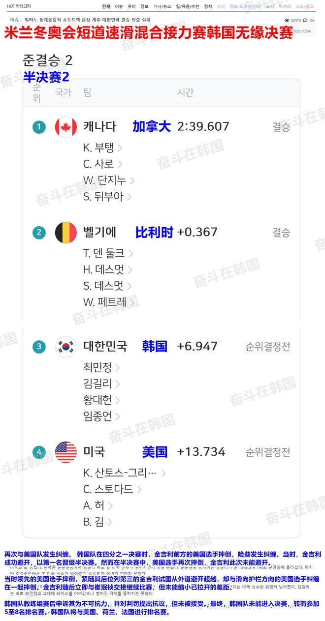 韩国网友热议米兰冬奥会短道速滑混合接力韩国队因美国队摔倒无缘决赛