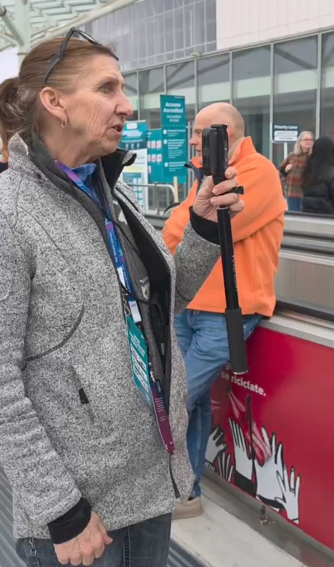 一个美国大姐正在采访观众。她用自拍杆举着手机,正在进行横屏录制。她的长相有点神似上了岁数的菲比(美国剧集《老友记》中的人物),保持着较好的身材,穿了一件浅色抓绒外套,眼睛是褐色的,很灵动。她的额头上堆积着四五道皱纹,显然并不年轻了。