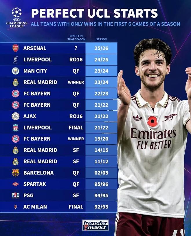 北京时间12月11日,在欧冠联赛阶段第6轮的比赛, 阿森纳客场3-0击败了布鲁日,目前以6战全胜的成绩领跑欧冠积分榜。对此德转列出自欧冠1992年改制以来,所有单赛季前6战全胜球队最