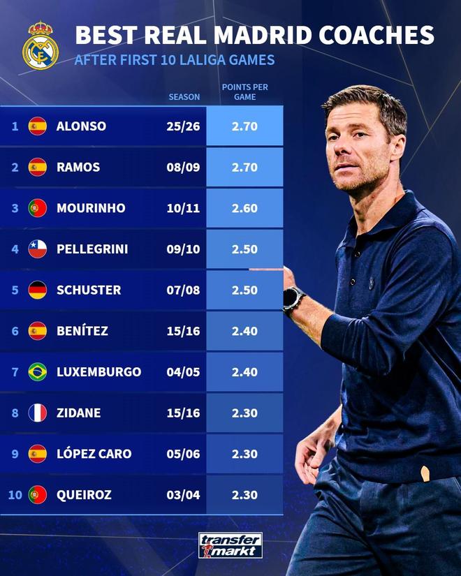 北京时间10月26日,西甲联赛第10轮,皇马在主场2-1战胜巴萨。据统计数据显示,在执教皇马的前10场西甲比赛中,阿隆索场均拿分达2.70分,与胡安德-拉莫斯并列俱乐部历史第一。历任皇马