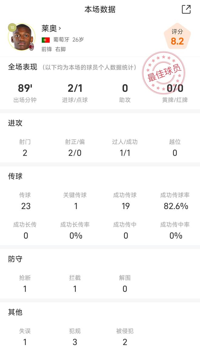 莱奥战佛罗伦萨全场数据:2脚射门打进2球助米兰逆转并登顶