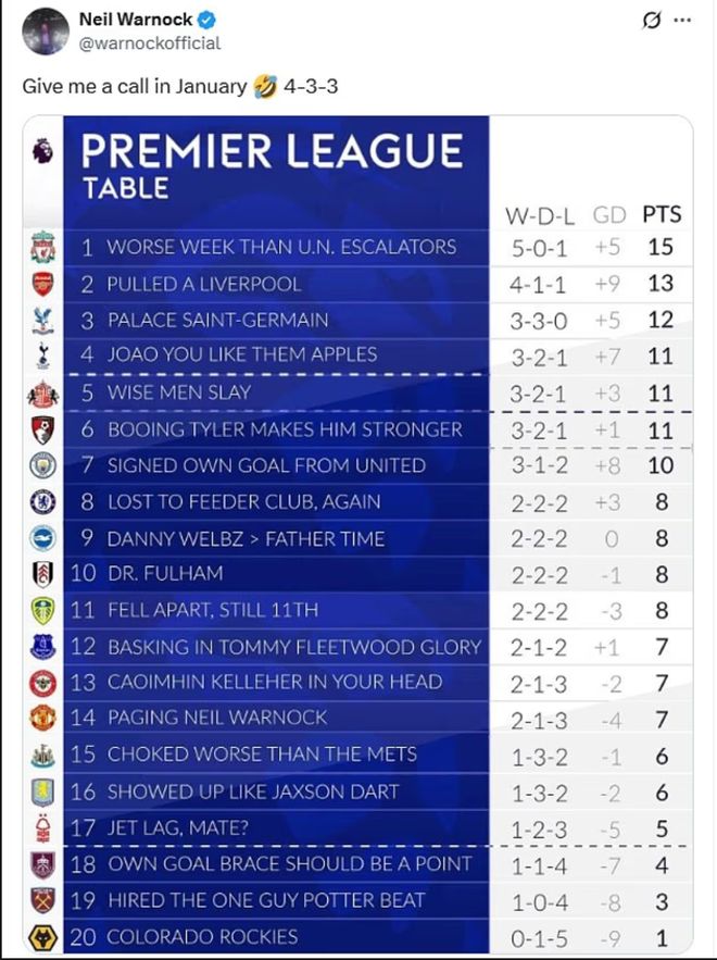 雷速体育10月2日讯 76岁的传奇救火教练尼尔·沃诺克通过社媒(X)发布一份动态,对英超各队的近况进行了调侃。他还用“一月份给我电话”来开玩笑,表示如果曼联解雇阿莫林,他会复出