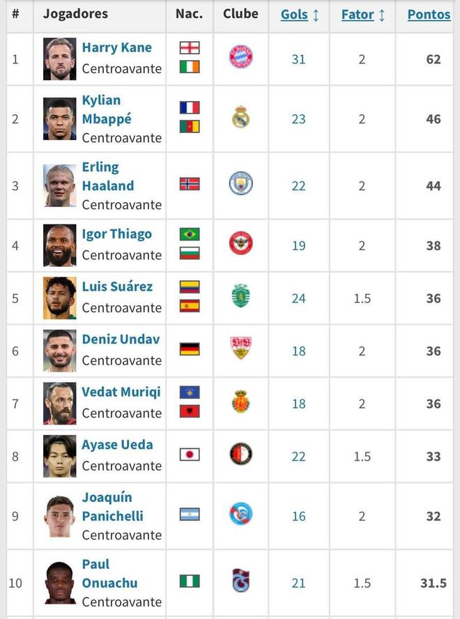 北京时间3月23日,德转列出了目前欧洲金靴奖排名前10的球员,哈里-凯恩以31球排名第一,姆巴佩23球第二,哈兰德22球第三,目前效力于费耶诺德的日本前锋上田绮世上榜。