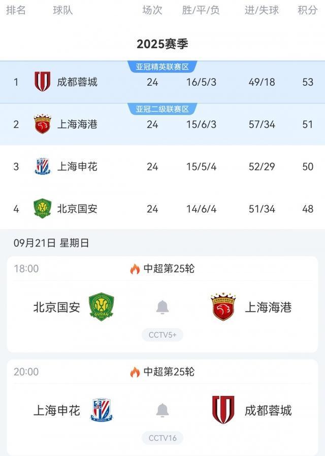 本周日的中超联赛,前四球队两两对决,其中申花主场vs蓉城,国安主场vs海港。