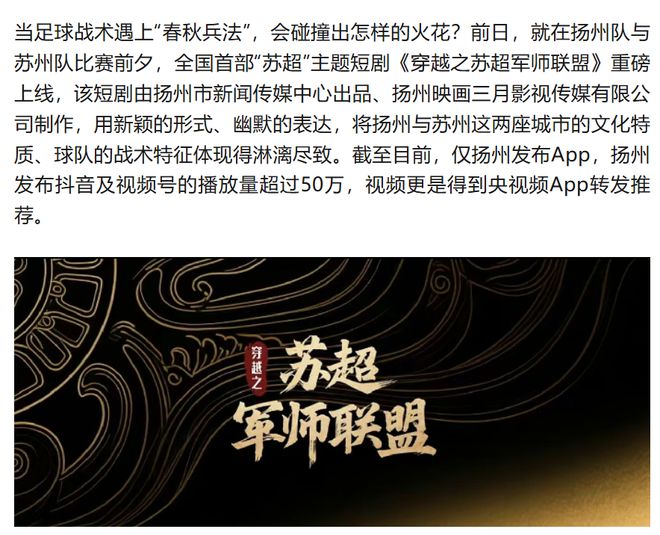现在还有《重生,我在苏超踢前锋》和《足Goal江苏》接力上线……